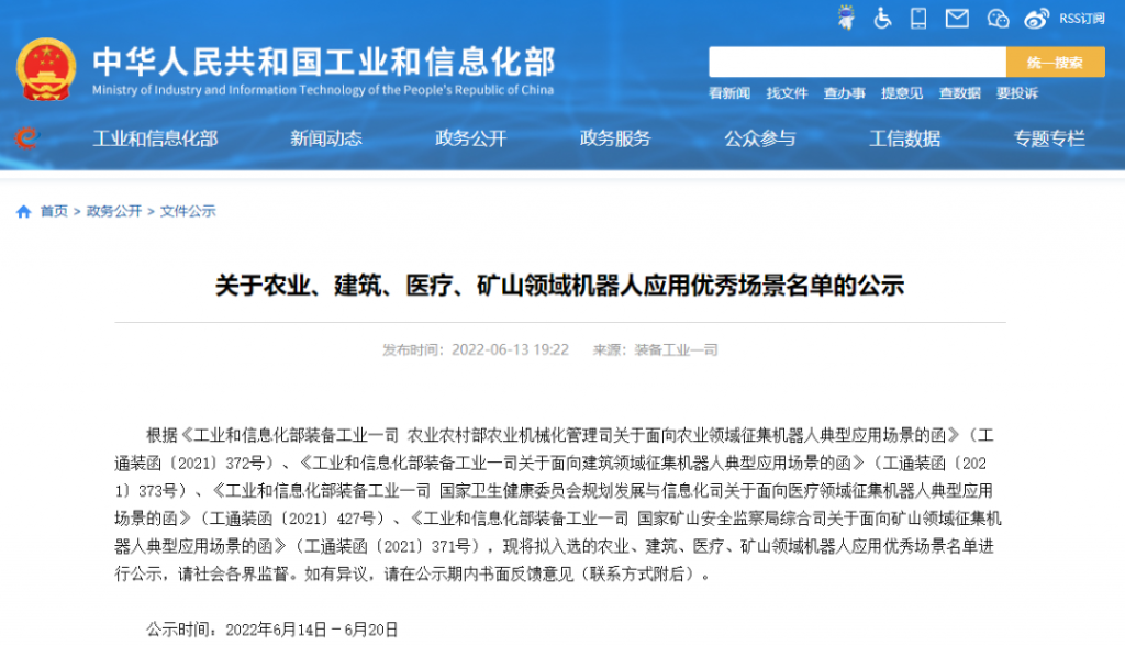 近日,工業和信息化部裝備工業一司、農業農村部農業機械化管理司、國家衛生健康委員會規劃發展與信息化司、國家礦山安全監察局綜合司四部門聯合發布《關于農業、建筑、醫療、礦山領域機器人應用優秀場景名單的公示》。其中,農業領域機器人應用優秀場景21個,建筑領域機器人應用優秀場景11個,醫療領域機器人應用優秀場景25個,礦山領域機器人應用優秀場景20個。