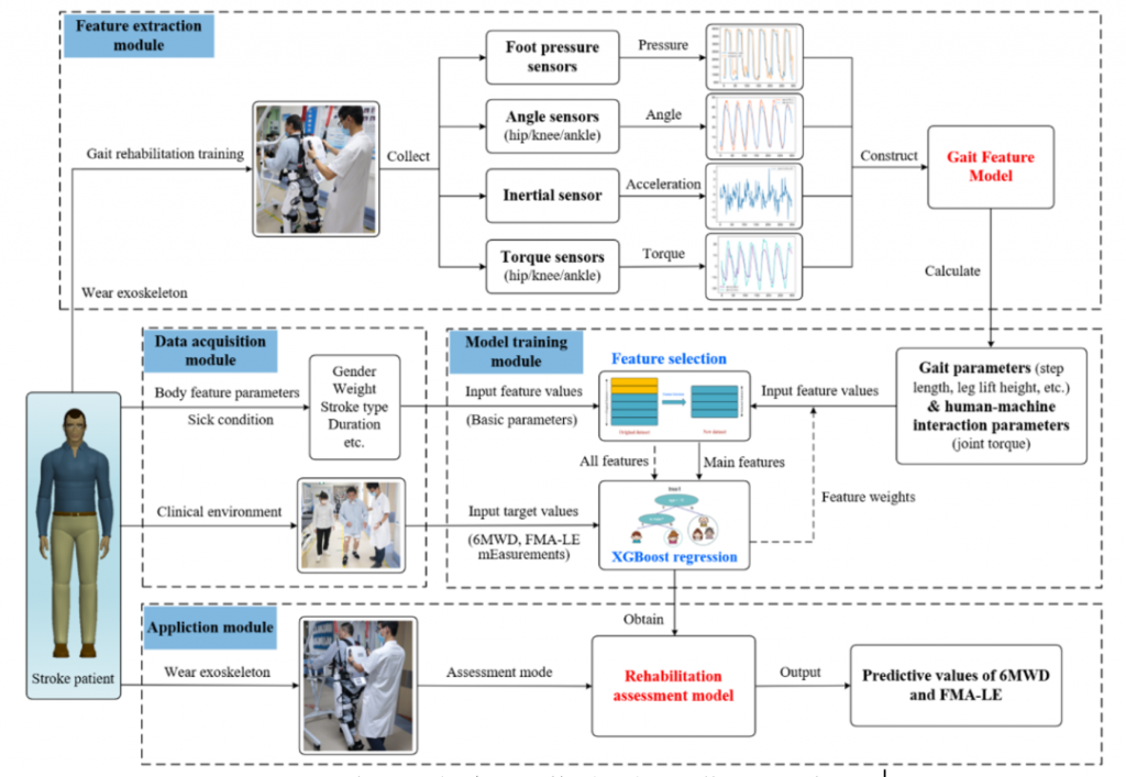 該論文提出一種新穎的基于下肢外骨骼機(jī)器人對(duì)中風(fēng)患者進(jìn)行智能康復(fù)評(píng)估的方法。其工作框架包括:數(shù)據(jù)采集模塊 – 收集并預(yù)處理患者的身體特征參數(shù)、患病狀況和運(yùn)動(dòng)生物力學(xué)參數(shù);特征提取模塊 – 根據(jù)外骨骼機(jī)器人傳感器數(shù)據(jù),構(gòu)造步態(tài)特征模型推導(dǎo)患者步態(tài)參數(shù);模型訓(xùn)練模塊 – 基于患者特征參數(shù)、步態(tài)參數(shù)及人機(jī)交互參數(shù),利用XGBoost機(jī)器學(xué)習(xí)算法訓(xùn)練康復(fù)評(píng)估模型;應(yīng)用模塊 – 評(píng)估模式下,康復(fù)評(píng)估模型可以預(yù)測新的中風(fēng)患者6MWD和FMA-LE值。